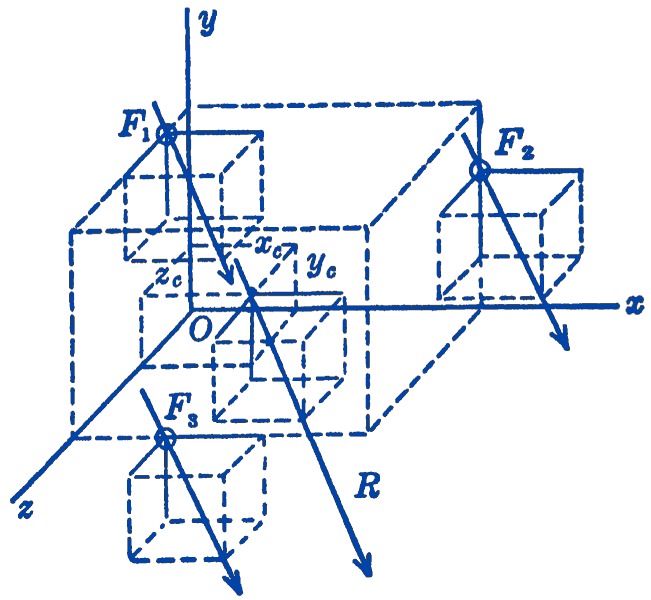 Considering the system of forces parallel to the \(x\)-axis, we have by the principle of moments: \[ \begin{aligned} & \left(R_{x}\right) y_{c}=\sum M_{z}=k_{1} F_{1} y_{1}+k_{1} F_{2} y_{2}+k_{1} F_{3} y_{3} \\ & \left(R_{y}\right) z_{c}=\sum M_{x}=k_{2} F_{1} z_{1}+k_{2} F_{2} z_{2}+k_{2} F_{3} z_{3} \end{aligned} \] but \[ R_{x}=k_{1} F_{1}+k_{1} F_{2}+k_{1} F_{3} \] so
