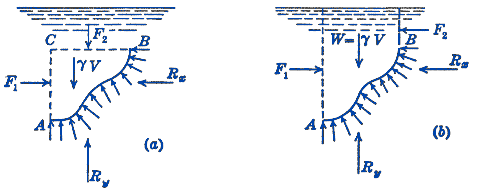 In Fig. 1a imagine a fluid element bounded by \(A B\), a horizontal plane \(B C\), and three vertical planes. For equilibrium of this element, we have: \[ \begin{gathered} \sum F_{x}=0=F_{1}-R_{x} \\ R_{x}=F_{1} \end{gathered} \] Hence the magnitude and the location of the horizontal component will be the same as the force acting upon the vertical plane \(A C\) and can be computed as in the preceding section.