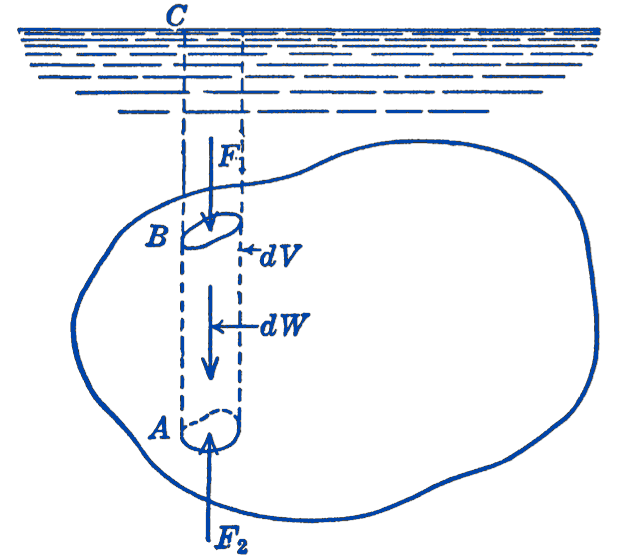 Considering the area at \(A\), there will be acting at \(A\) a force \(F_{2}\) which is equal to the weight of the fluid in the column \(A C\). There is also acting at \(B\) a downward force \(F_{1}\), which is equal to the weight of the fluid in the column \(B C\). There will thus be a net upward force \(F_{2}-F_{1}\) acting on the element which will be equal to the weight of the fluid contained in the volume \(d V\), i.e., the volume of the column \(A B\). This net upward force upon the element is called a buoyant force. If we now add up the buoyant forces on all of the elements of the body, we find that the total buoyant force acting upon the body is equal to the weight of the fluid displaced by the body.