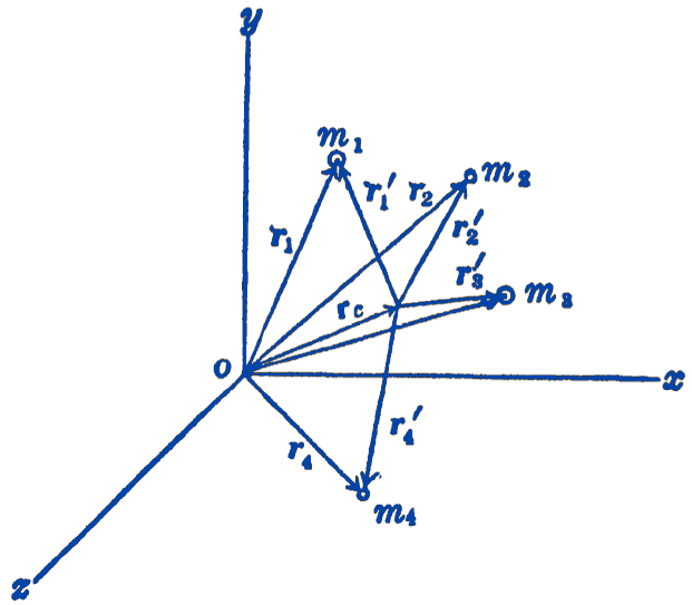 We can show that this point has the property that, if we multiply each mass by the vector from the center of mass to the particle, the sum of these moment products is zero, for: \[ \begin{aligned} \sum m \mathbf{r}^{\prime} & =\sum m\left(\mathbf{r}-\mathbf{r}_{c}\right)=\sum m \mathbf{r}-\sum m \mathbf{r}_{c} \\ & =\mathbf{r}_{c} \sum m-\mathbf{r}_{c} \sum m=0 \end{aligned} \] If we write \(r_{c}\) and \(r\) in terms of the rectangular components of the system, we have: \[ \begin{aligned} \mathbf{r}_{c} & =x_{c} \mathbf{i}+y_{c} \mathbf{j}+z_{c} \mathbf{k} \\ \mathbf{r} & =x \mathbf{i}+y \mathbf{j}+z \mathbf{k} \end{aligned} \] Substituting in equation (1) and equating components, we have: \[ \begin{aligned} x_{c} & =\frac{\displaystyle \sum m x}{\displaystyle\sum m} \\ y_{c} & =\frac{\displaystyle\sum m y}{\displaystyle\sum m} \\ z_{c} & =\frac{\displaystyle\sum m z}{\displaystyle \sum m} \end{aligned} \]