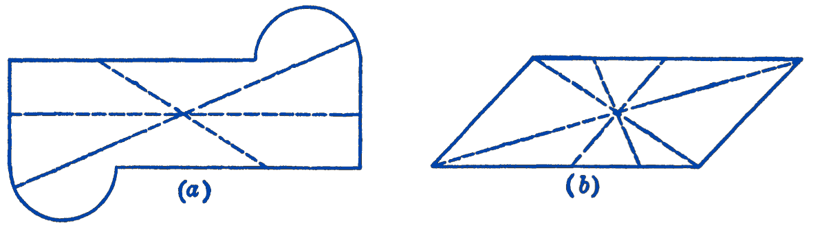 In many cases the location of the centroid or center of gravity of a figure can be found by a consideration of the symmetry of the shape. If an area has an axis of symmetry, the centroid must be somewhere on this axis, and, if the area has two axes of symmetry, the centroid lies at the intersection of the two axes. Some figures which do not have an axis of symmetry may be said to have a center of figure, i.e., a point which is the midpoint of all elements of the figure which pass through the point. This point in many cases can be determined by inspection, as in the examples shown in Fig. 1.