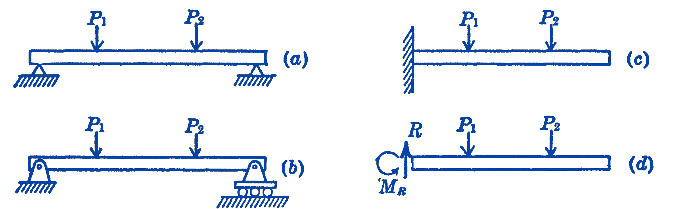 The type of reactive force system set up will depend upon the way in which the beam is supported. We shall limit our present discussion to statically determinate supports, so that the reaction forces will in all cases be determined completely from the equations of statics applied to the whole beam as a free body.