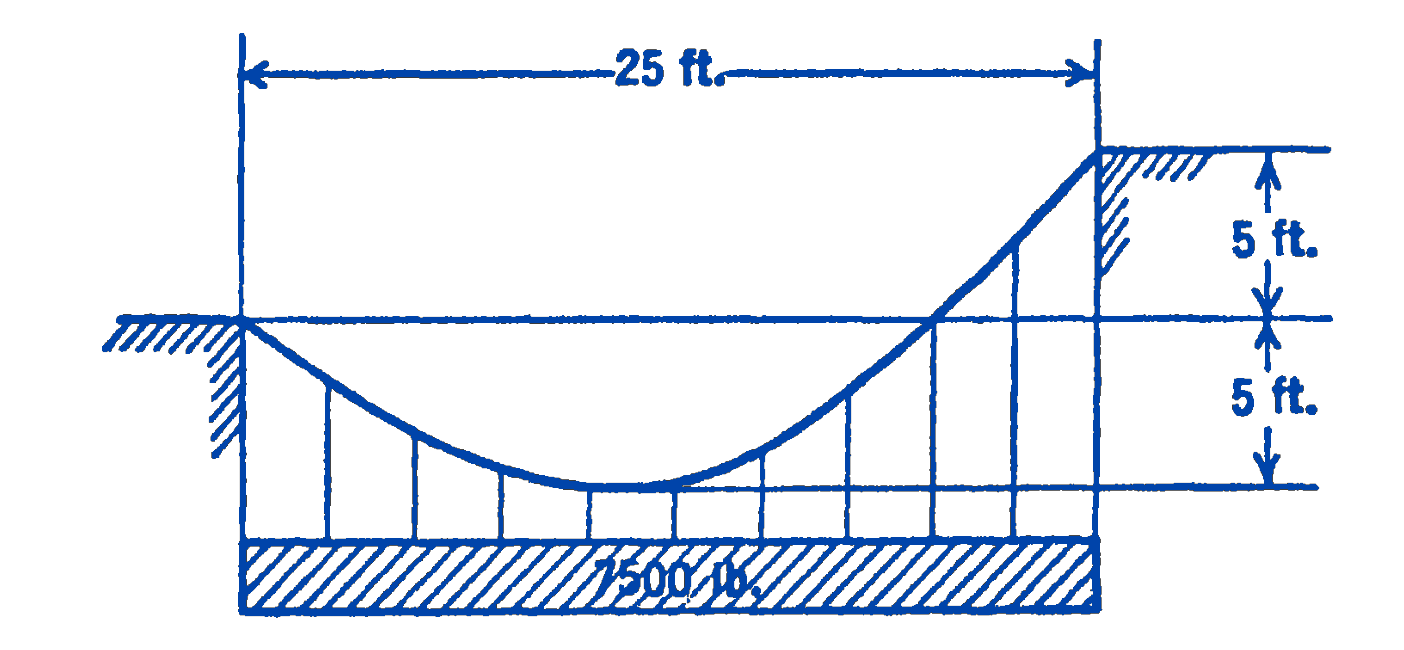 2. A cable 100 ft long is suspended from two points which are on the same level and which are 95 ft apart. If the cable supports a total load of 10,000 lb, uniformly distributed along the horizontal, what is the maximum force in the cable?