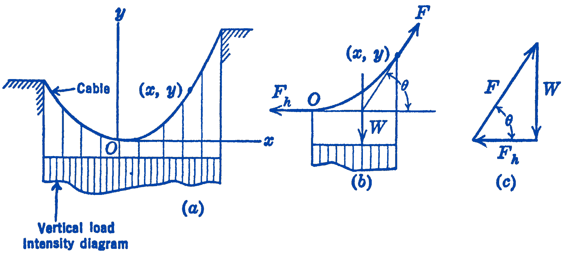 From the force diagram of Fig. 1c we have: \[ F=\sqrt{F_{h}^{2}+W^{2}} \] so that for the uniform horizontal load \[ \begin{equation*} F=\sqrt{F_{h}^{2}+w^{2} x^{2}} \tag{2} \end{equation*} \] From this it appears that the horizontal force \(F_{h}\) at the lowest point in the cable is the smallest force in the cable, and that this force increases as \(x\) increases, becoming a maximum at the support.