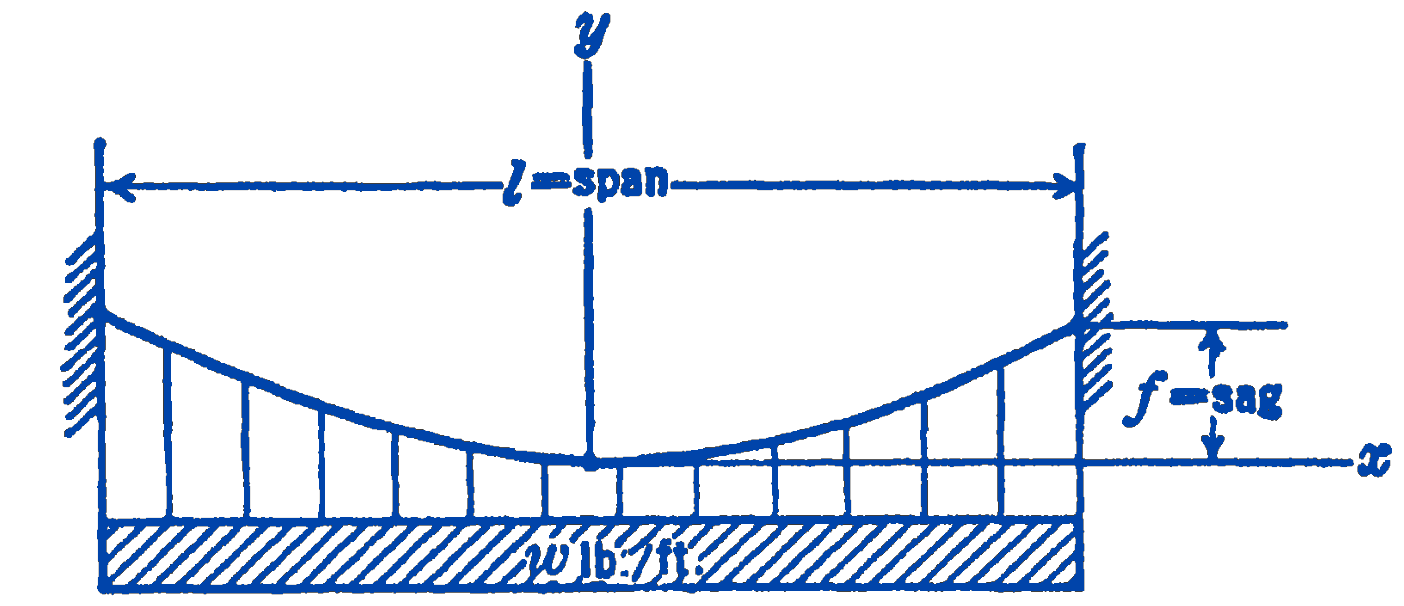 Expressing these in terms of the “sag ratio” \(\left(\frac{f}{l}\right)\) we have: \[ F_{h}=\frac{w l^{2}}{8 f^{2}}, \text { so that }\left(\frac{w l}{2 F_{h}}\right)=4\left(\frac{f}{l}\right) \]