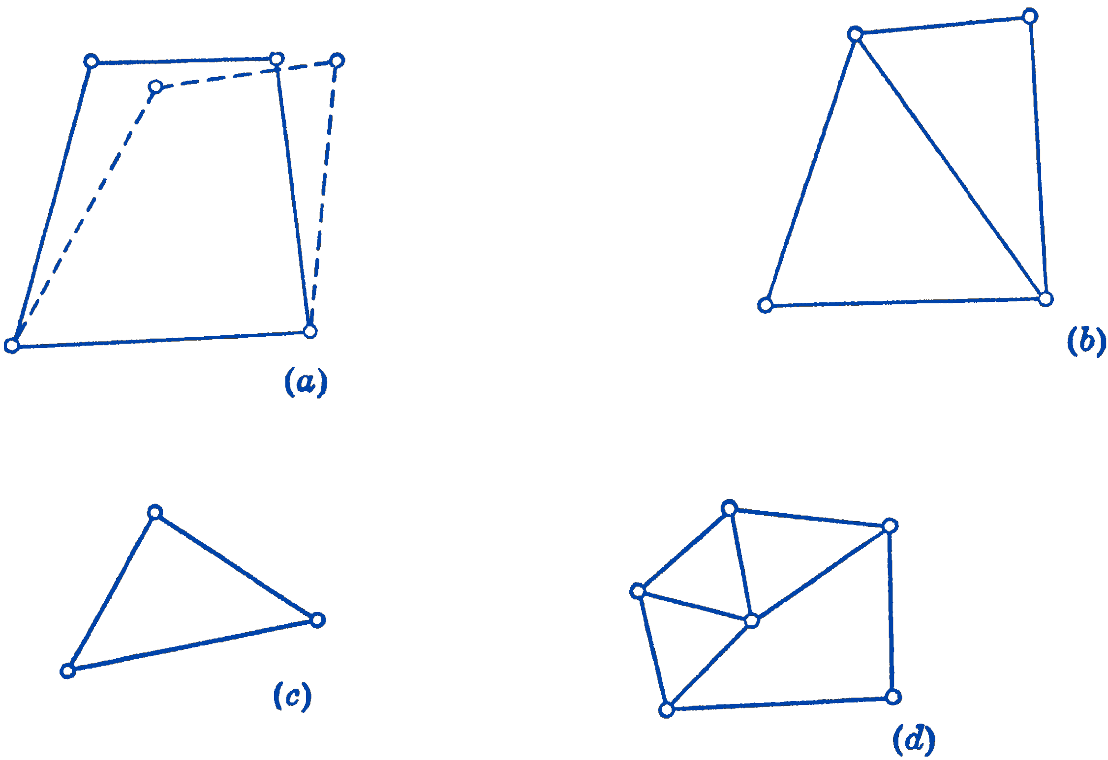 In Fig. 1a, a framework consisting of four bars pinned together at their ends is shown. It will be seen that such an arrangement is not a rigid framework, since the whole system can deform as shown by the dotted lines, without changing the dimensions of the members. This deformation could be prevented, however, by the addition of one more member as shown in Fig. 1b. The framework, which now consists of two triangular sections, will be seen to be rigid. The simplest rigid system is the triangular framework, Fig. 1c, and any complex system which is formed by triangular sections, as Fig. 1d, will also be a rigid framework.
