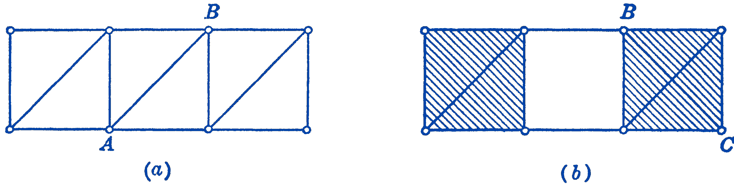 In Fig. 6-2a a rigid framework is shown which satisfies the above condition. By moving the member \(A B\) to the position \(B C\) in Fig. 6-2b, the frame becomes non-rigid, since the right-hand shaded section could be translated with respect to the left-hand shaded section. Thus the frame in (b) is non-rigid even with the same relationship between members and joints, since the bar \(B C\) is so placed that it does not maintain the complete constraint of the frame. If the necessary condition is fulfilled, however, one can usually easily tell by inspection whether the frame is rigid, or whether an exceptional condition such as illustrated above is present.
