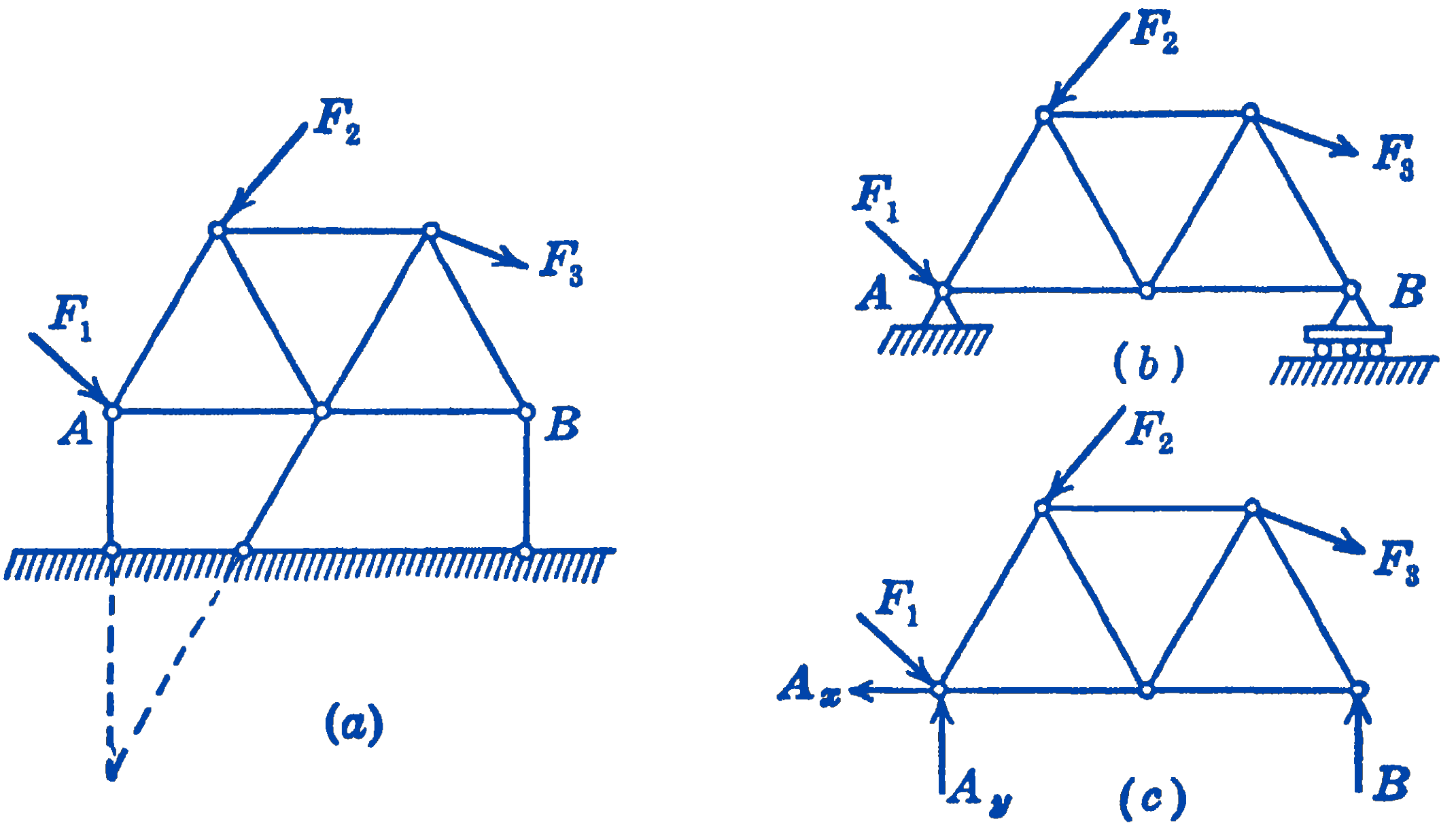 We now suppose that the framework which is constrained by its supports is loaded by a system of external forces (as \(F_{1}, F_{2}\), and \(F_{3}\) in Fig. 3), and we investigate the problem of finding the unknown forces in the members and the unknown reactions at the supports. The total number of unknown elements will be the \((2 j-3)\) axial forces in the members, plus the three reaction forces, so that the total number of unknown forces is (2j). The forces acting at each joint of the structure form a concurrent, coplanar force system, for which two independent equations can be written. Thus, the total number of independent equations that ćan be written for the whole system is (\(2 j\)), which will just suffice for the determination of the (\(2j\)) unknowns. Such a system is said to be statically determinate, and the equilibrium equations alone will suffice for the solution of all of the unknown forces in the system.