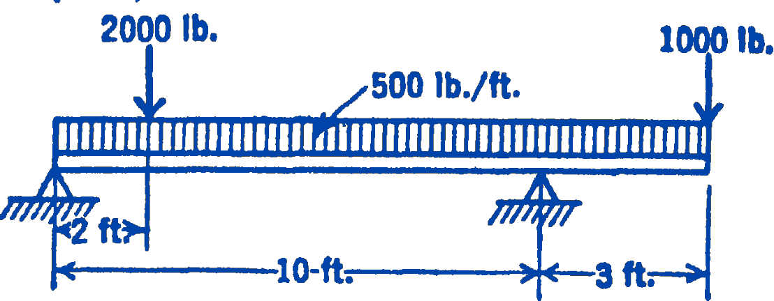 \(\sum M_{A}=0=-(2)(1000)-(6)(2000)+(10)\left(R_{2}\right) ; \quad R_{2}=1400\ \mathrm{lb}\)