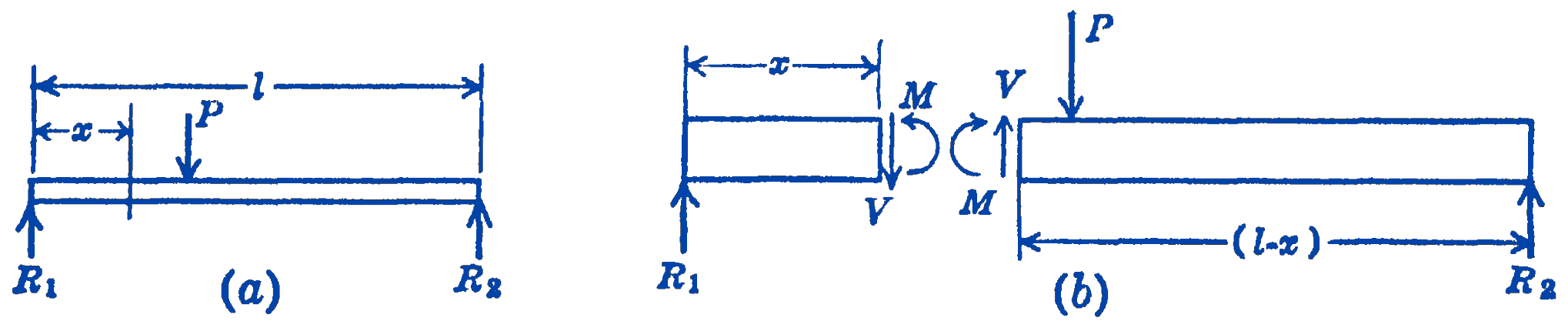 To find the internal forces in a beam at a particular section, one can imagine that the beam is cut at that section, and a free-body diagram of one portion of the beam can be drawn. Consider, for example, the simply supported beam with a single concentrated load, as shown in Fig. 1a, and suppose that we wish to know the internal forces in the beam at a section a distance \(x\) from the left reaction.