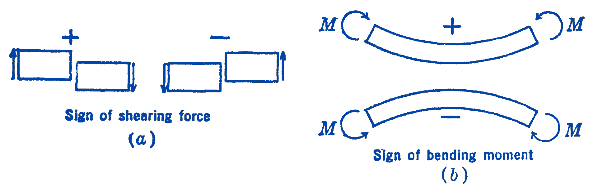 In Fig. 1b the beam is shown cut at the section \(x\) into two free-body diagrams. The actual forces acting on the cut cross section can be represented as in this example, but for our present purpose all that we require is the resultant of all of the forces normal to the beam axis, which we shall call the shearing force \(V\) in the beam, and the moment of the couple formed by the compression forces on the top portion of the beam and the tension forces on the bottom portion of the beam, which we shall call the bending moment \(M\) in the beam. Our present purpose is the determination of this shearing force and this bending moment for each section of the beam. From the complete free-body diagram of the beam shown in Fig. 1a, the two reaction forces \(R_{1}\) and \(R_{2}\) can be found. Thus, the free-body diagram of either end of the beam in Fig. 1b will contain only the two unknowns \(V\) and \(M\), which can therefore be found directly from the equations of statics. To decide on a sign convention for \(V\) and \(M\), we note that the shearing force on the left section is directed downward, while the shearing force on the right section, being the equal and opposite reaction of the other force, is directed upward. In order, however, to have one sign for the shearing force at one point in the beam, the convention is adopted that, if the shear in a beam is in such a direction that the right portion of the beam would tend to move downward with respect to the left portion, the shearing force at that point is positive. For a similar reason, a bending moment which tends to bend the beam concave upward is called a positive bending moment. These conventions are illustrated in Fig. 2.