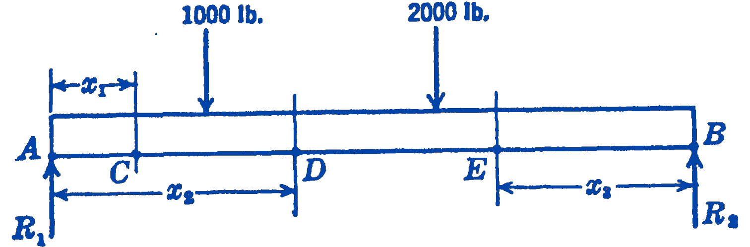 To find the shearing force at any point between \(R_{1}\) and the 1000-lb load, a free-body diagram (Fig. 5) of the portion of the beam to the left of section \(C\) is drawn: