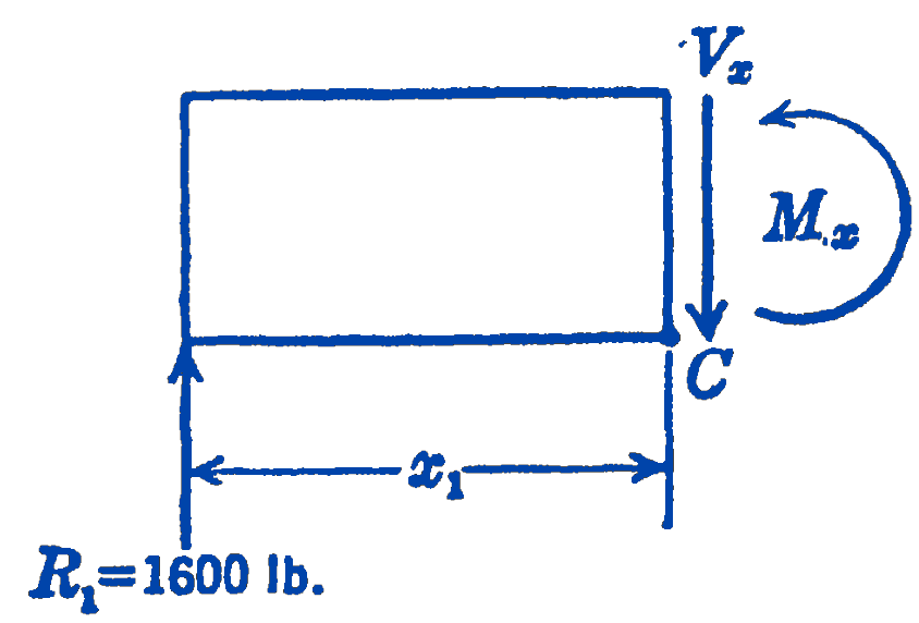 \[ \begin{aligned} \sum F_{y} & =0=1600-V_{x} ; \quad V_{x}=1600\ \mathrm{lb} \\ \sum M_{c} & =0=M_{x}-1600 x_{1} ; \\ M_{x} & =1600 x_{1}\ \mathrm{ft}\cdot\mathrm{lb} \end{aligned} \]