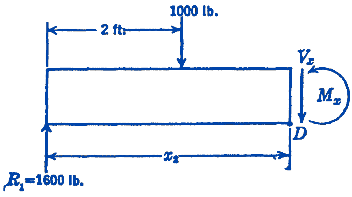 For the next section of the beam, between the 1000-lb load and the 2000-lb load, we draw a free-body diagram (Fig. 6) of the portion of the beam to the left of section \(D\).