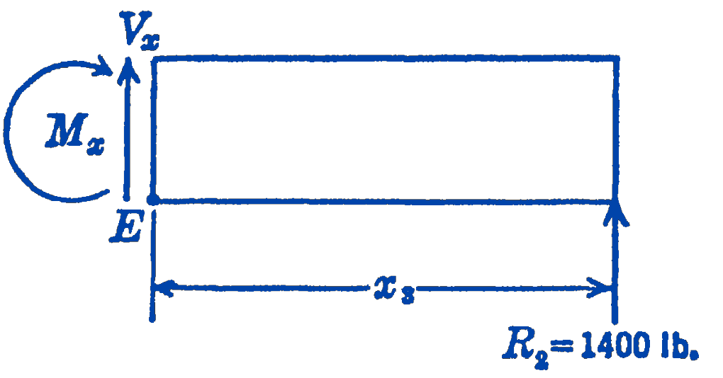 \[ \begin{aligned} \sum F_{y}=0 & =1400+V_{x} ; \quad V_{x}=-1400\ \mathrm{lb} \\ \sum M_{B} & =0=1400 x_{3}-M_{x} ; \quad M_{x}=1400 x_{3}\ \mathrm{ft}\cdot\mathrm{lb} \end{aligned} \]