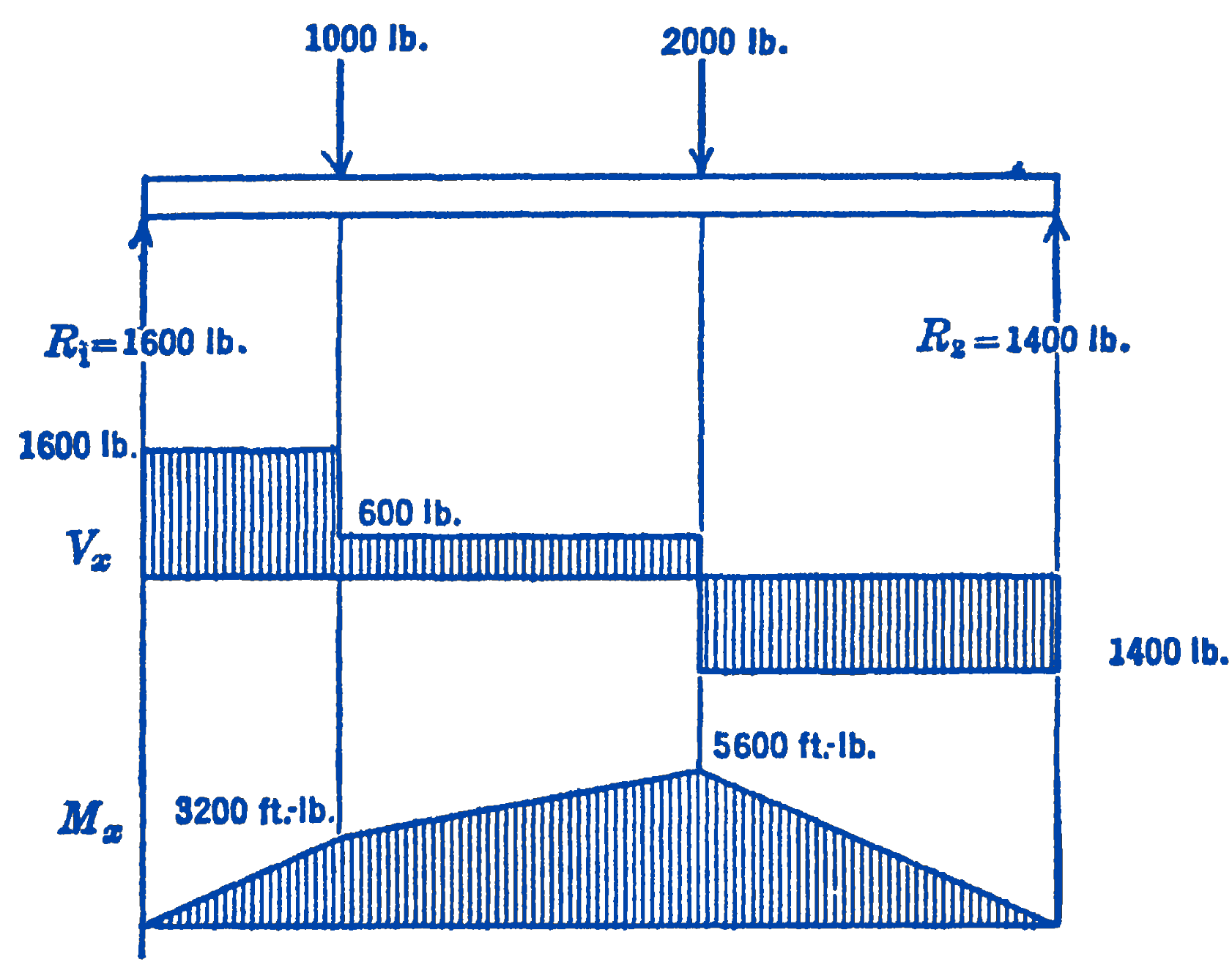 The way in which the shearing force and the bending moment vary along a beam is usually shown by drawing a diagram beneath the beam as in the following examples. It should be noted that the same shearing force and bending moments will be computed for both portions of the beam. One usually selects as a free-body diagram the portion of the beam which involves the smaller number of forces.