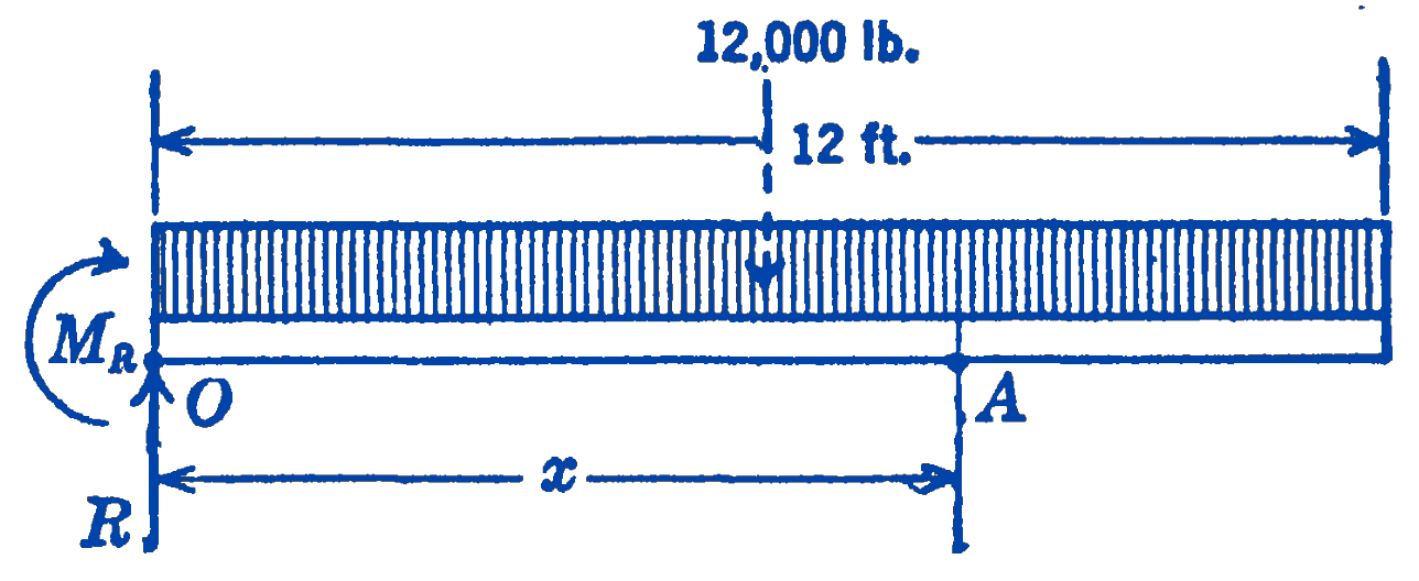 \[ \begin{aligned} \sum F_{y} & =0=12,000-1000 x-V_{x} \\ V_{x} & =12,000-1000 x\ \mathrm{lb} \\ \sum M_{A} & =0=M_{x}+(1000 x)\left(\frac{x}{2}\right)+72,000-12,000 x \\ M_{x} & =12,000 x-500 x^{2}-72,000\ \mathrm{ft}\cdot\mathrm{lb} \end{aligned} \]