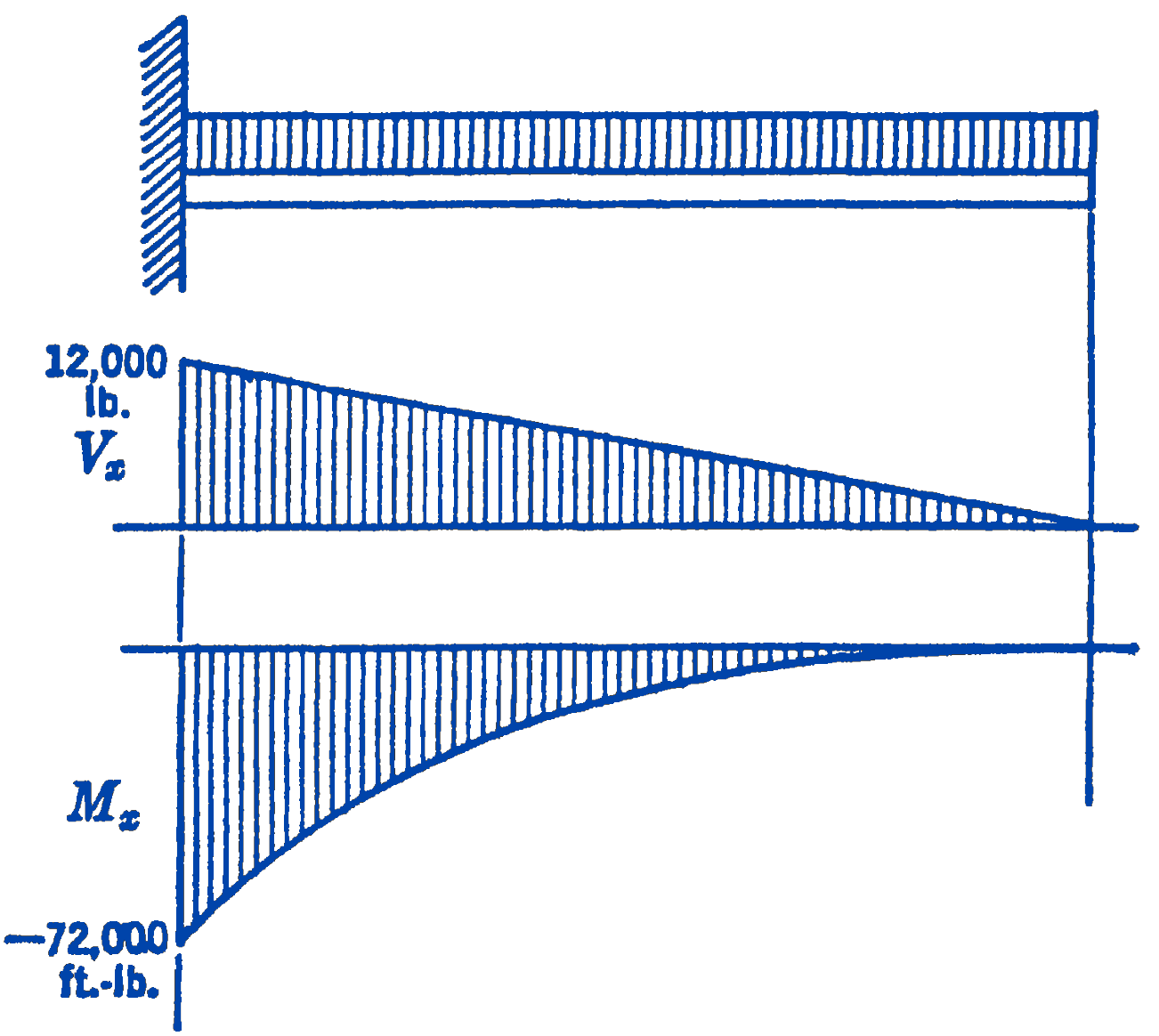 Example 2. Draw the shearing force and bending moment diagrams for the cantilever beam with the uniformly distributed load shown in Fig. 9.
