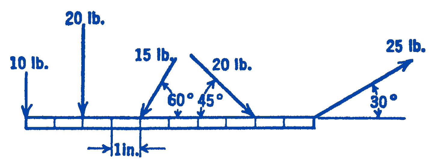 2. A system of forces acts on a beam as shown in the diagram. Find the resultant of the system by the graphical method.