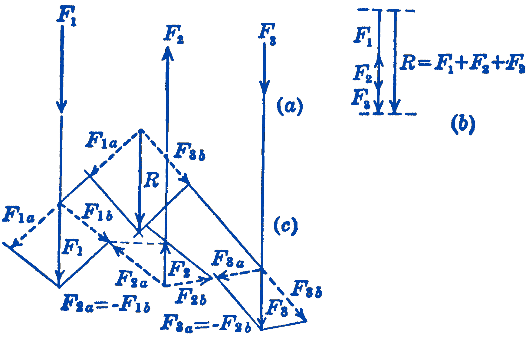 We first resolve the force \(F_{1}\) into two components, which may have any direction. These components are shown as \(F_{1 a}\) and \(F_{1 b}\) in Fig. 1c. We next resolve the force \(F_{2}\) into two components, one of which is equal in magnitude, opposite in direction, and colinear with the component \(F_{1 b}\) of the first force. Similarly, the third force is resolved into two components, one of which is equal in magnitude, opposite in direction, and colinear with the component \(F_{2 b}\) of the second force. We have thus replaced the original system of three parallel forces by a system of six non-parallel forces. Furthermore, four of these forces occur in equal and opposite pairs, so that they cancel out, and we have thus reduced the system of three parallel forces to a system of two non-parallel forces for which the resultant can be directly found. It will be seen that this method could be extended to include any number of forces, and that this system of any number of parallel forces will always be reduced to two forces.