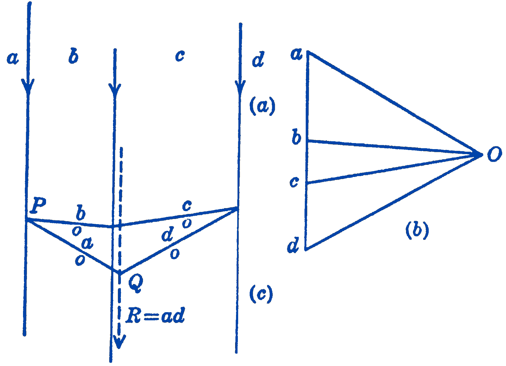 We next transfer these force components to the diagram of Fig. 2c. Since each force is to be resolved into two components, some point on the line of action of each force will be intersected by two lines parallel to the rays which represent the two force components. We can begin the diagram by selecting any point \(P\) on the line of action of the force \(a b\), and by drawing through this point lines parallel to the rays \(ao\) and bo. Having drawn the line \(bo\) in Fig. 2c, the intersection of bo with the line of action of the force \(b c\) can be found, and through this point a line parallel to the ray co can be drawn. Each of the original forces is resolved into two components, all of which except two cancel out. The remaining two components \(ao\) and \(od\) then give the resultant force ad, and their point of intersection \(Q\) in Fig. 2c establishes the location of the resultant. Since we have already determined the magnitude of \(R\) from the force diagram of Fig. 2b, we do not need to show the force magnitudes in Fig. 2c which we use only to determine the location of the resultant.
