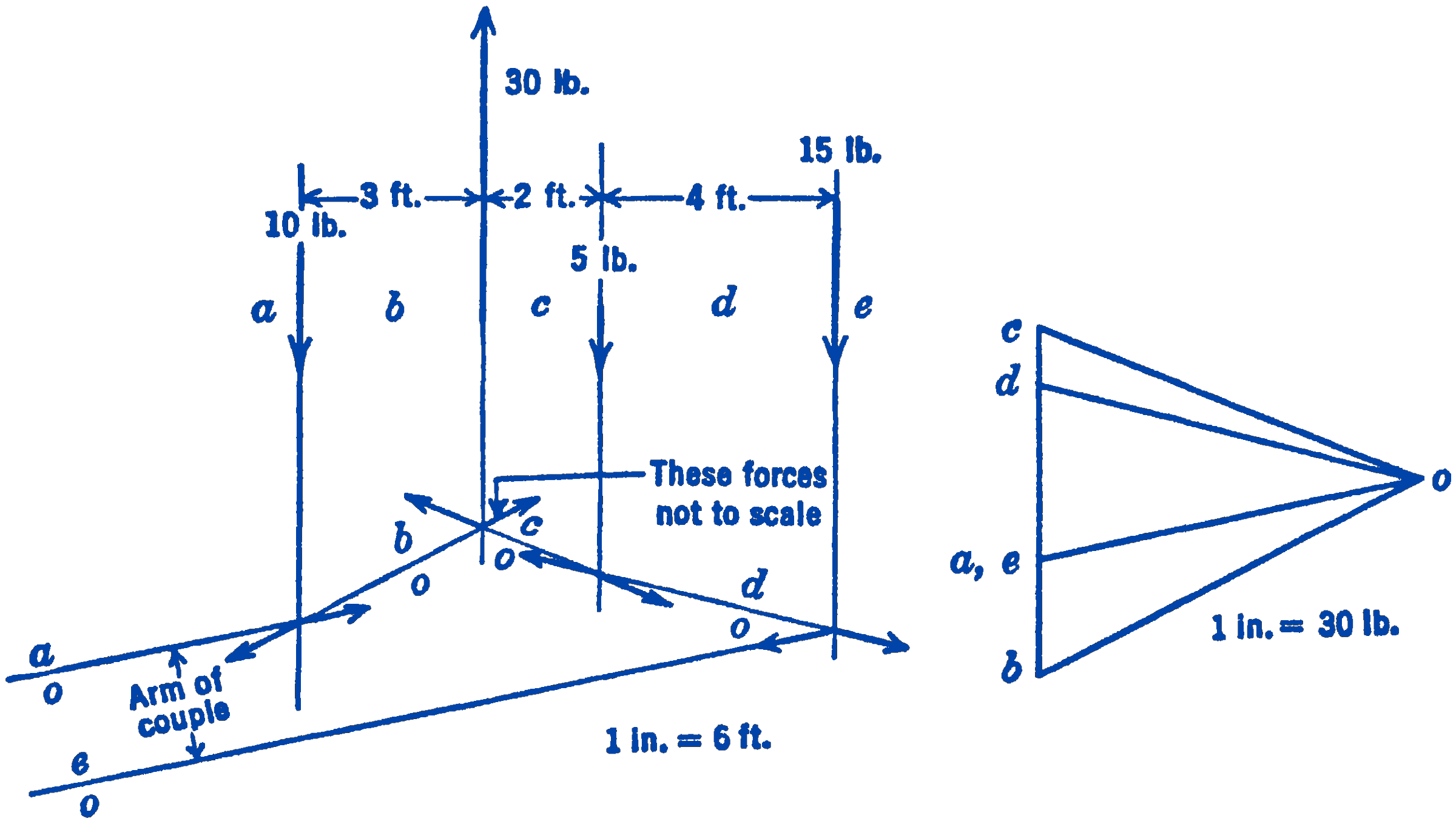 Four parallel forces having the magnitudes and positions shown are to be graphically added. From the force diagram of Fig. 3 it will be seen that the resultant force is zero, since the point \(e\) turns out to be coincident with the point \(a\). If we draw the funicular diagram we find that the first and last strings \(ao\) and \(e o\), the intersection of which should give the location of the resultant, do not intersect but are parallel, thus indicating that the resultant is a couple. The moment of the couple will be seen to be clockwise, or negative, and the magnitude of the couple will be equal to the magnitude of the component ao times the distance between the strings \(ao\) and \(eo\):