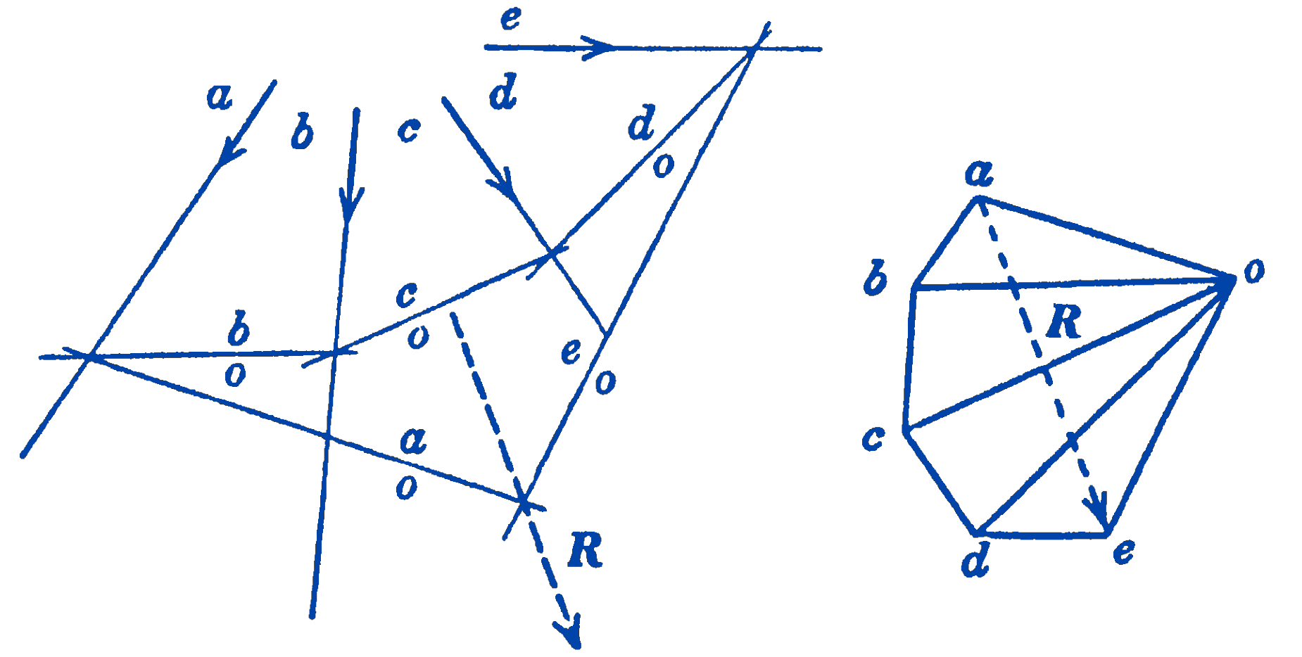 The figure formed by the lines \(ao\), \(bo\), \(co\), and \(do\), in Fig. 2c is called the funicular or string diagram, or polygon, since it has the form which would be assumed by a flexible string loaded by the original forces.2 The lines in the funicular diagram which are parallel to the rays of the force diagram are called strings.
