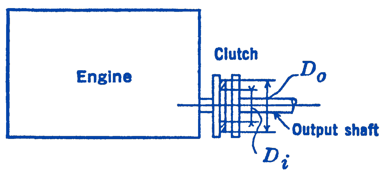 The torque is transmitted by means of the annular friction surface having an outer diameter \(D_{o}\) and an inner diameter \(D_{i}\). The friction disk has an asbestos facing for which the coefficient of friction is 0.3. If the force per unit area of the disk (assumed to be constant) is to be limited to 30 lb per sq in, and if \(D_{i}=6\ \mathrm{in}\), what should be the value of \(D_{o}\) and what axial force is required to engage the clutch?