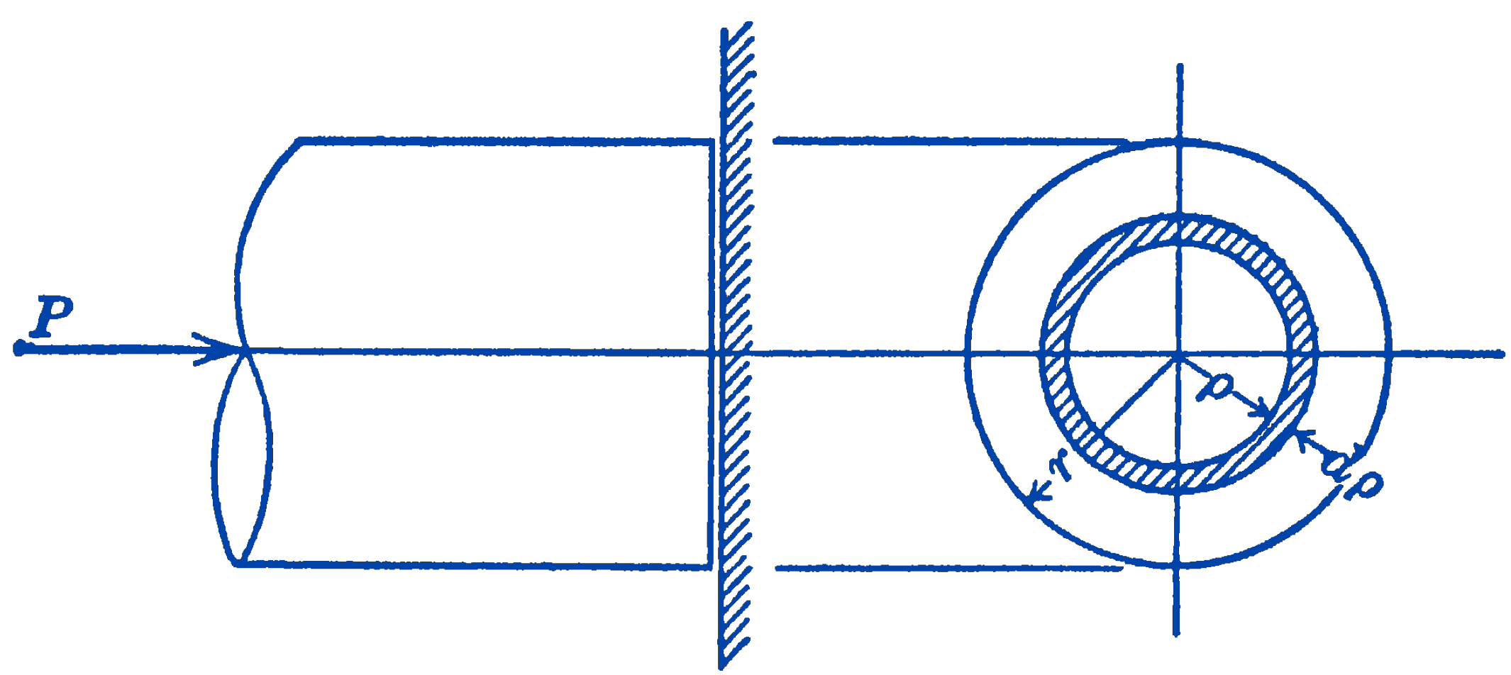 Consider an infinitesimal element in the form of an annular ring of radius \(\rho\) and thickness \(d \rho\). We must now assume some force distribution over the surface. The simplest assumption will be that of a uniform force distribution. Let us say that the unit force or pressure at any point on the surface is \(p\) per unit area. This is related to the total force \(P\) by the fact that: \[ p A=P=p \pi r^{2}. \] The normal force acting on the infinitesimal annular area \(d A\) is equal to: \[ p\, dA=(p)(2 \pi \rho\, d \rho) \] The frictional force tangent to the surface is: \[ d f=\mu p 2 \pi \rho\, d \rho \] The frictional moment about the axis of the shaft, due to the one element shown, is: \[ d M=\rho(\mu p 2 \pi \rho\, d \rho) \] To find the total friction torque we sum up the elements for the whole area: \[ \begin{aligned} M & =2 \pi \mu p \int_{0}^{r} \rho^{2} d \rho=\left.2 \pi \mu p\left(\frac{\rho^{3}}{3}\right)\right|_{0} ^{r} \\ & =2 \pi \mu \frac{P}{\pi r^{2}} \frac{r^{3}}{3}=\frac{2}{3} r \mu P \end{aligned} \] hence, the friction force acts as though it were concentrated at a distance of \(\frac{2}{3} r\) from the center.