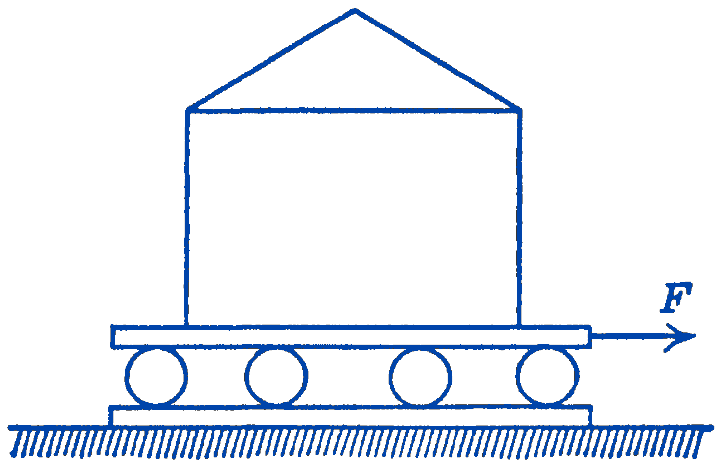 1. A house is being moved by pulling it along on planks and wooden rollers as is shown in the diagram. If the total weight of the house is 30,000 lb, find the required horizontal force to move the house at a uniform velocity. The diameter of the rollers is one foot.