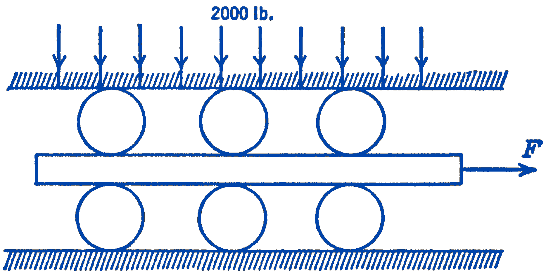 2. A straight board is loaded between two sets of rollers as is shown in the accompanying figure. The diameter of the rollers is 3 in., and the coefficient of rolling resistance for all surfaces in contact is 0.01 in . The whole system is loaded vertically by a uniformly distributed load of 2000 lb. Both the top and bottom surfaces are arranged so that they cannot move horizontally. What horizontal force \(F\) is required to move the board?