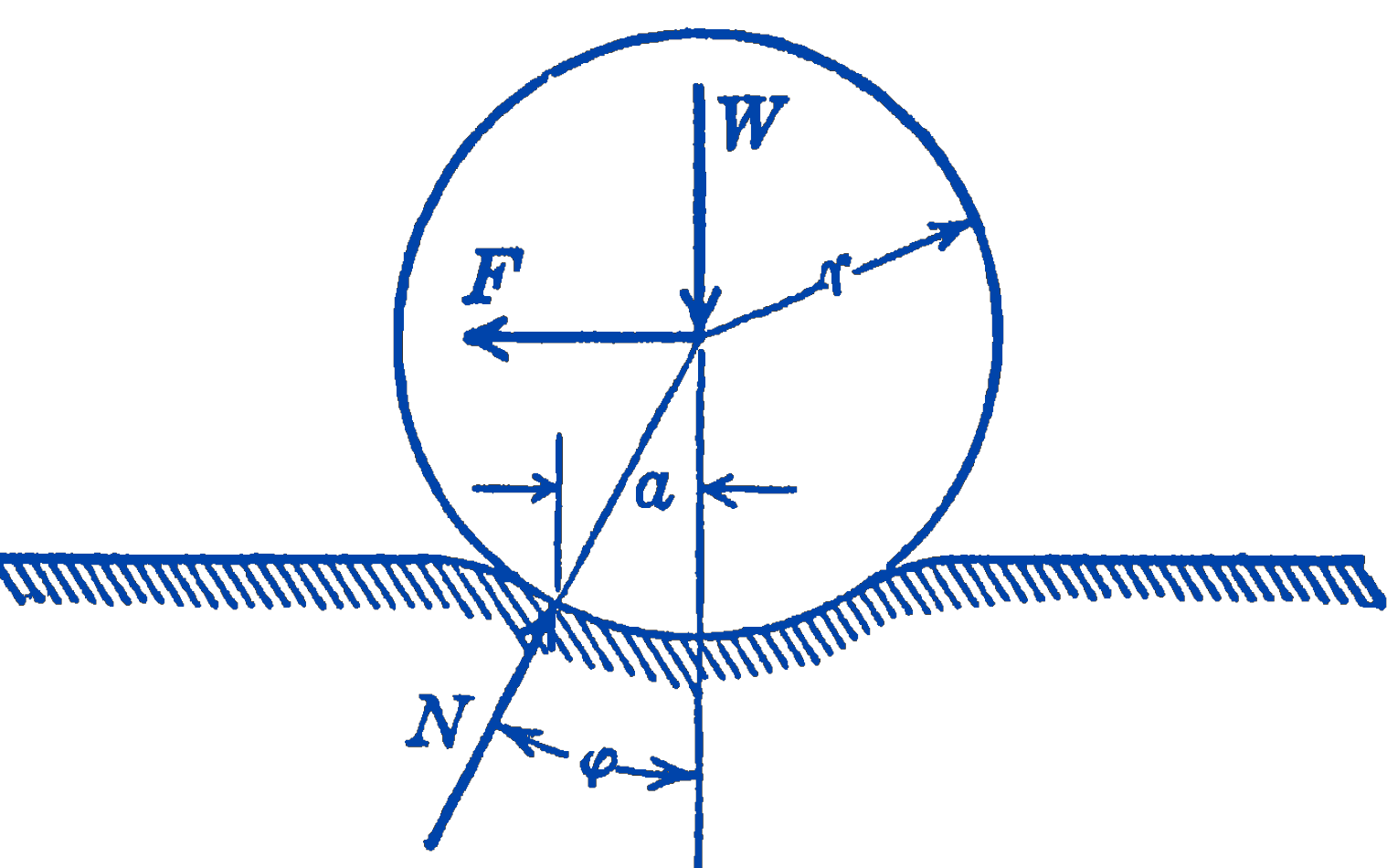 Imagine a wheel loaded by a force \(W\) moving to the left along a track with a uniform velocity, as in Fig. 1. Because of the continuous deformation of the track, a horizontal force \(F\) is required to keep the system in equilibrium, and this force is thus a measure of the rolling resistance of the wheel. The amount of rolling resistance is usually specified by giving the distance \(a\), which is sometimes called the coefficient of rolling resistance. It should be noted, however, that this distance a should not properly be called a coefficient, and that it is related to the frictional force as follows: \[ \begin{aligned} F & =N \sin \phi \\ W & =N \cos \phi \\ F & =W \tan \phi \end{aligned} \]