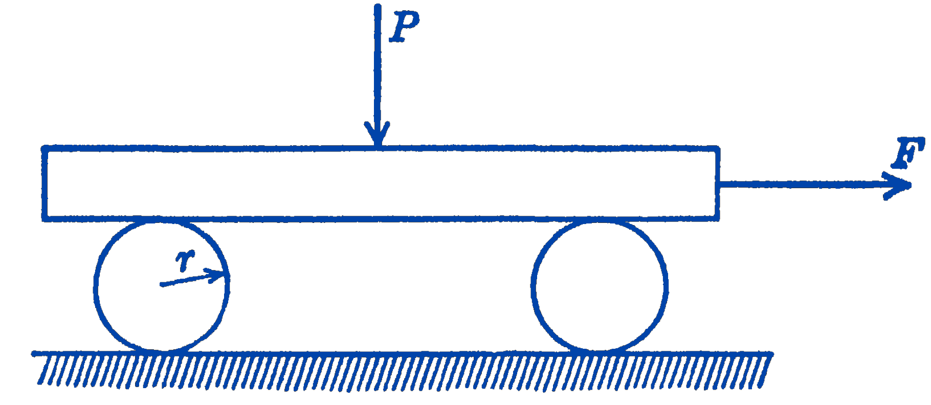 Example. A board carrying a load \(P\) at its midpoint rests on two cylindrical rollers of radius \(r\), as shown in Fig. 2. Find the force \(F\) required to move the board.