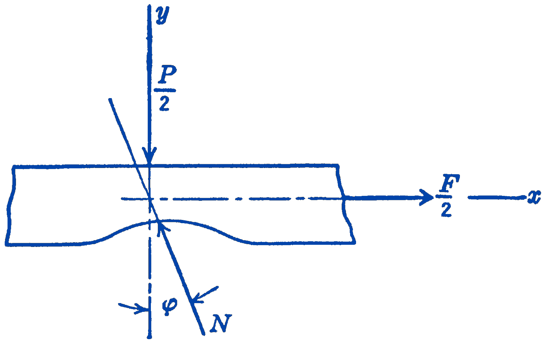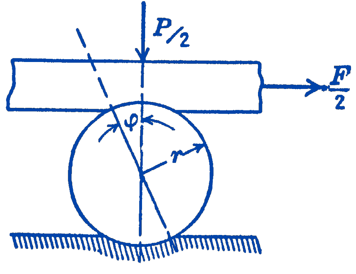 hence: \[ \begin{aligned} & N=\frac{P}{2 \cos \phi} \\ & F=2 N \sin \phi=2 \sin \phi\left(\frac{P}{2 \cos \phi}\right) \\ & F=P \tan \phi \end{aligned} \] For small values of \(\phi\) we have \(\tan \phi \approx \sin \phi\), also \(\sin \phi=\dfrac{a}{r}\), where \(a\) is the “coefficient of rolling resistance,” as defined above; thus \[ F=\frac{P a}{r} \] Note that, although we have in this problem two rolling surfaces, i.e., double-rolling, the same answer is obtained that was found above for single-rolling contact. There are twice the rolling surfaces, but the force is applied in such a position that it is twice as effective in producing rolling motion, so that the net result is the same.