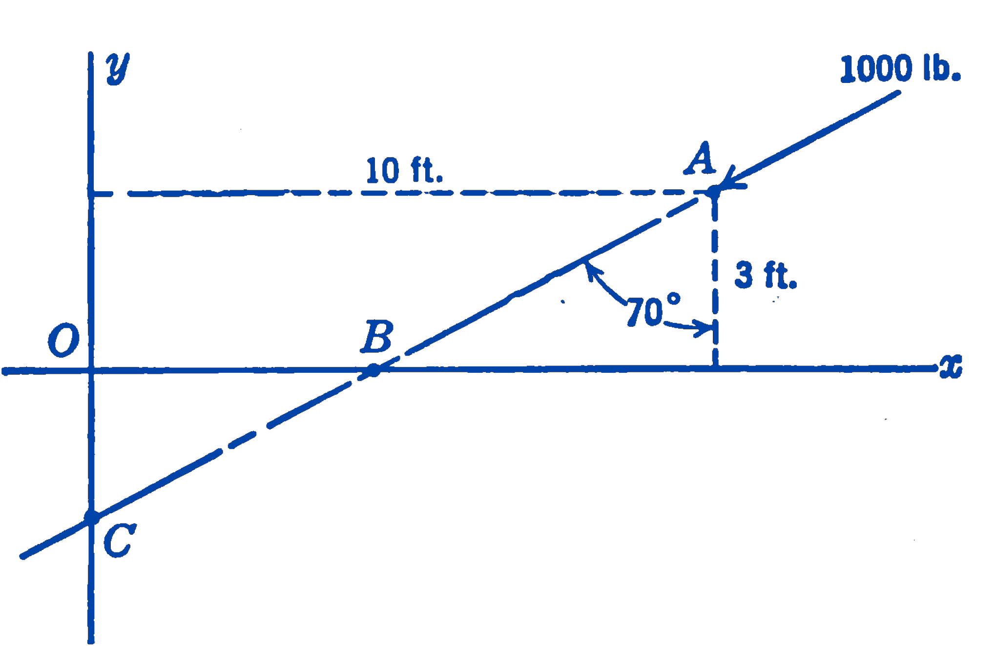 2. Calculate the moment of the 1000-lb force about the point \(O\), (a) by multiplying the force by the perpendicular distance from \(O\) to the line of action of the force, and (b) by resolving the force into rectangular components at the point \(A\), using the theorem of moments. (c) Repeat, by resolving the force into components at points \(B\) and \(C\).
