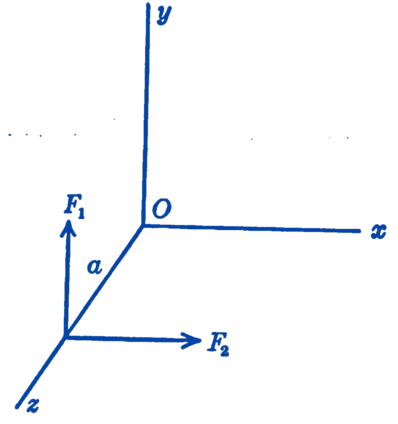 3. \(F_1\) is parallel to the \(y\)-axis and \(F_2\) is parallel to the \(x\)-axis and the lines of action of the two forces intersect the \(z\)-axis at a distance \(a\) from the \(xy\) plane. Show that if the two vectors \(M_1\) and \(M_2\) representing the moments of \(F_1\) and \(F_2\) about \(O\) are added, the resultant vector \(M\) correctly represents the moment of the resultant of the two forces about the point \(O\).