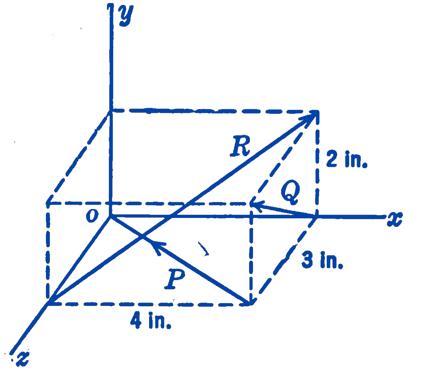 5. Forces \(P, Q,\) and \(R\) are applied along the diagonals as shown in the figure. If \(2P = 2Q = R = 1000\) lb, what is the moment sum about each coordinate axis? What is the resultant moment about \(O\)?