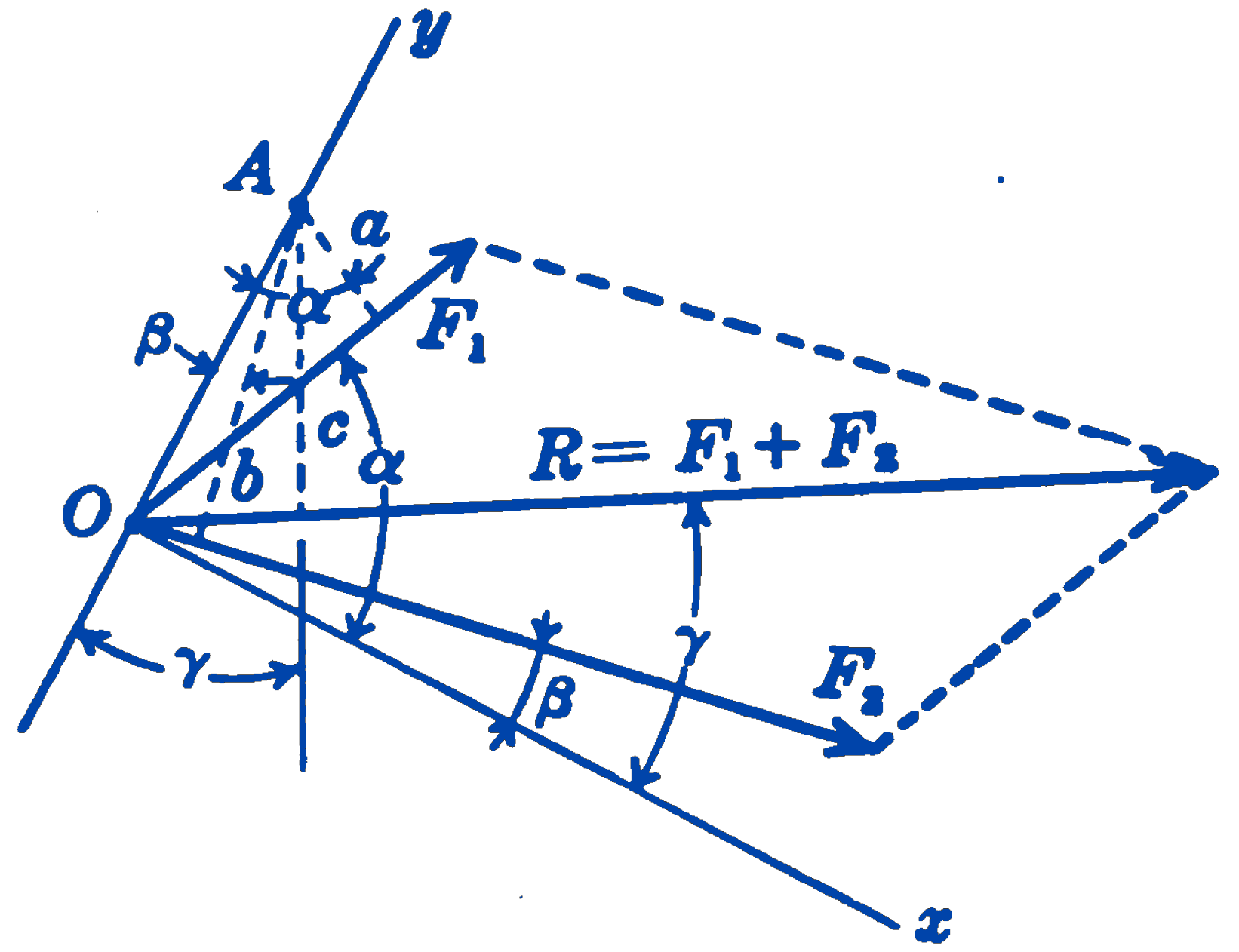 Consider the two forces \(F_1\) and \(F_2\) shown in Fig. 1, with point of concurrence \(O\) and moment-axis \(A\). Take for the \(y\)-axis a line through \(O\) and \(A\). Writing components along the \(x\)-axis, we have: \[ R \cos \gamma = F_1 \cos \alpha + F_2 \cos \beta \] Multiply each term by the distance \(OA\). \[ R(OA) \cos \gamma = F_1(OA) \cos \alpha + F_2(OA) \cos \beta \] From the geometry of Fig. 1, it will be seen that: \[ (OA) \cos \alpha = a \\ (OA) \cos \beta = b \\ (OA) \cos \gamma = c \] so that: \[ R(c) = F_1(a) + F_2(b) \] Since \((F_1)(a)\) is the moment of \(F_1\) about \(A\), \((F_2)(b)\) is the moment of \(F_2\) about \(A\), and \((R)(c)\) the moment of the resultant about \(A\), the theorem for this case is proved.